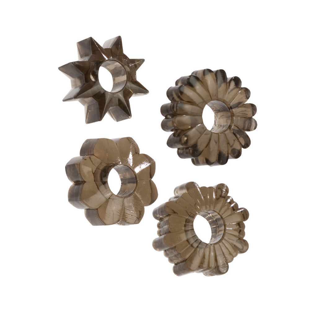 This divine California Exotic pleasure set is a ceremonial offering in 4-pack design—super stretchy TPR enhancers that honour the sacred art of versatile sizing, celebrating the goddess who embraces variety paired with smoke-tinted mystery.
